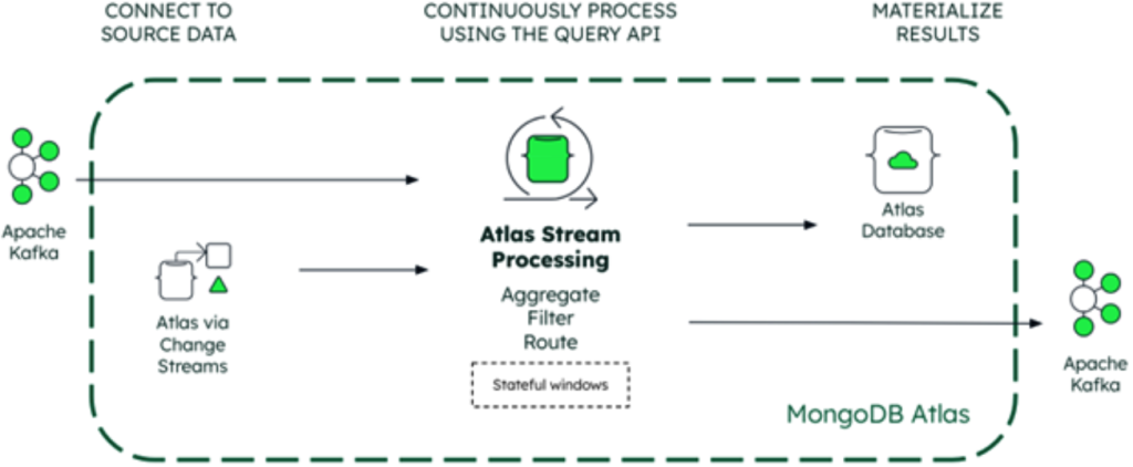 The Atlas Streaming Processor is a kind of aggregation pipeline that operates on an isolated machine, separate from your Atlas cluster. It can read events from Kafka topics or MongoDB Change Streams, process the data, and then either store the results in a MongoDB database or emit another event to Kafka. It’s important to note that the Streaming Processor (SP) is not an event store; it functions solely as an event processor.