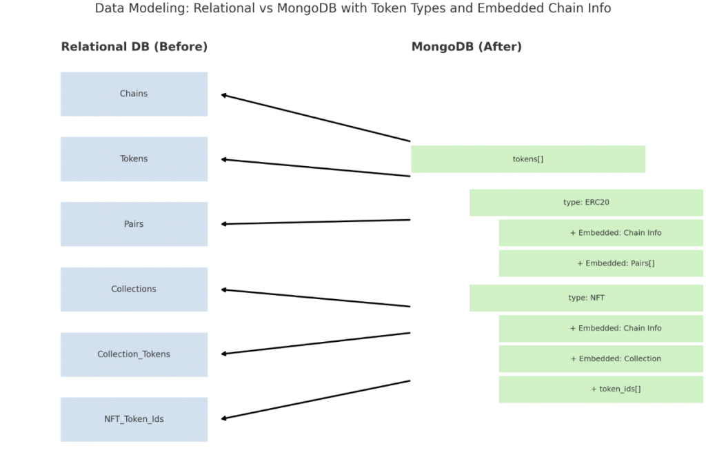 Another major advantage I found with MongoDB was the ability to seamlessly expand to new blockchains and token types. In a traditional relational setup, onboarding a new chain often required creating additional tables, modifying foreign key relationships, and updating resolvers or GraphQL schemas to support new data structures.